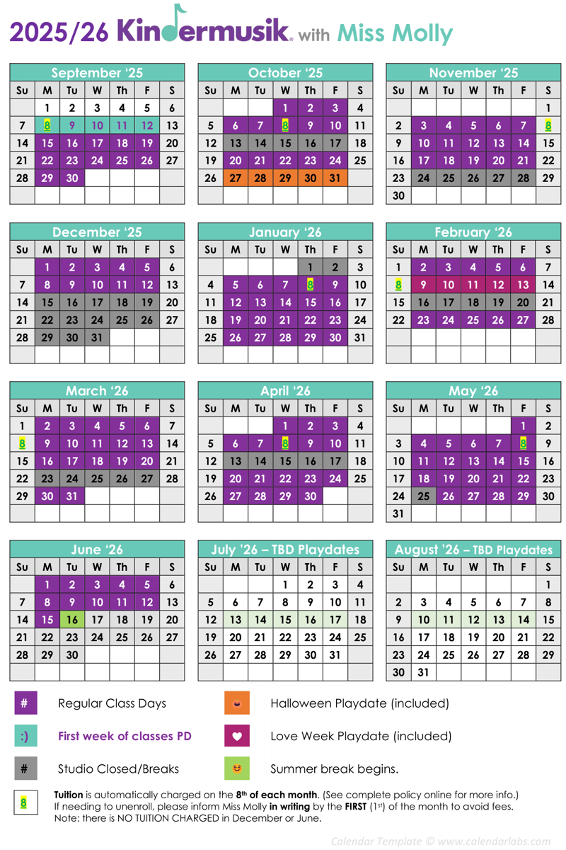 Our studio calendar follows the "school year" calendar of local schools. (Subject to change for weather etc).